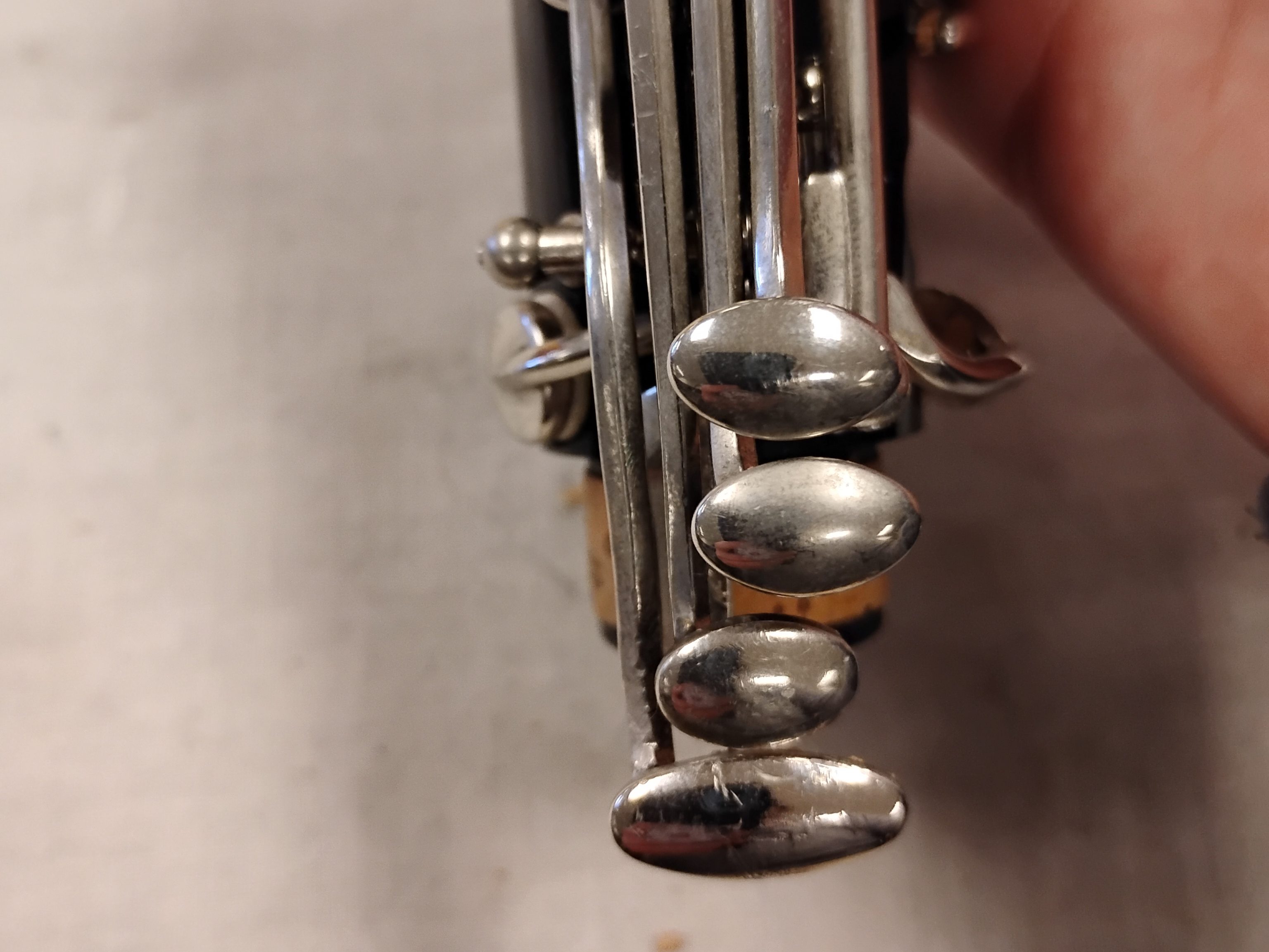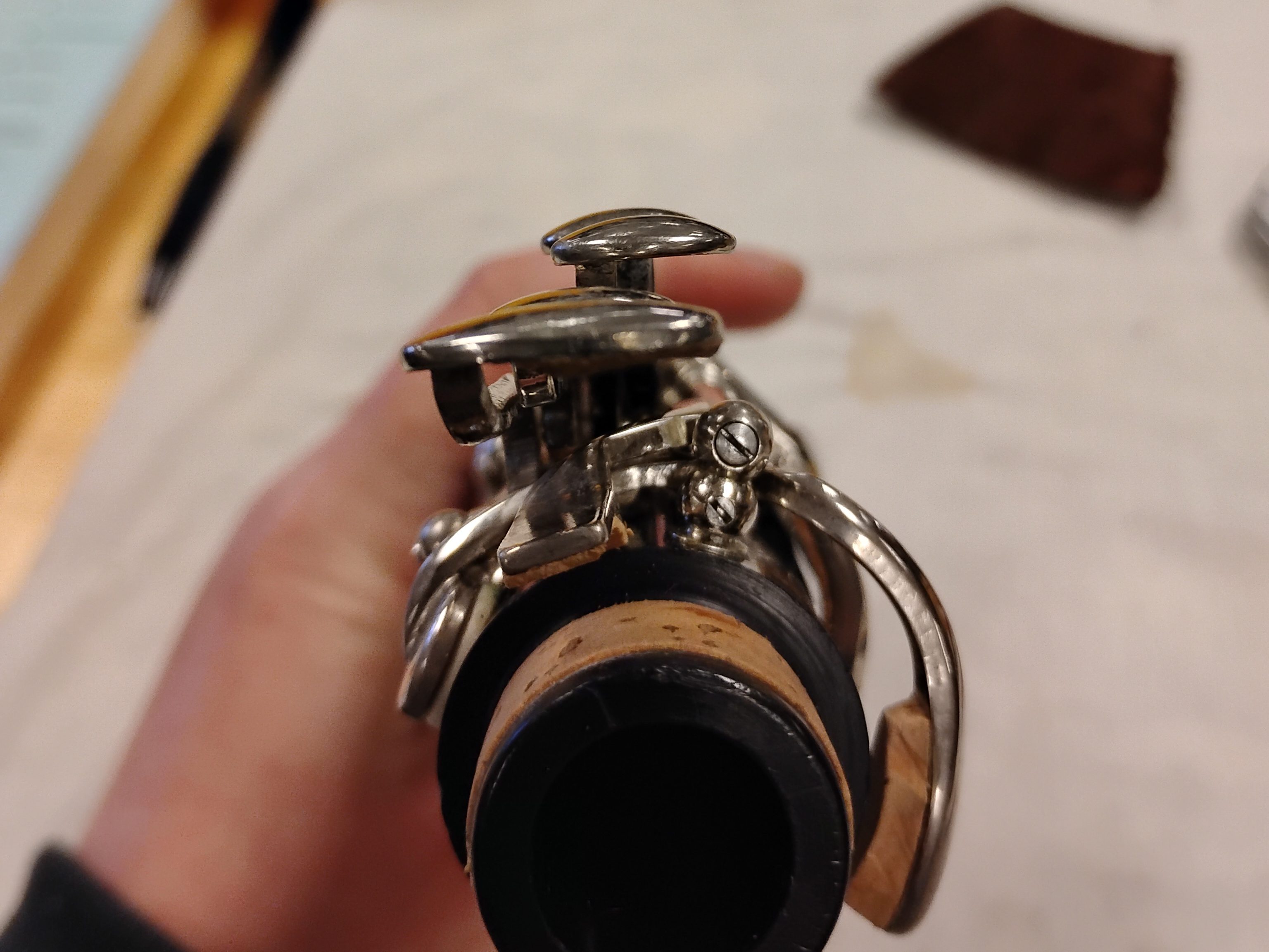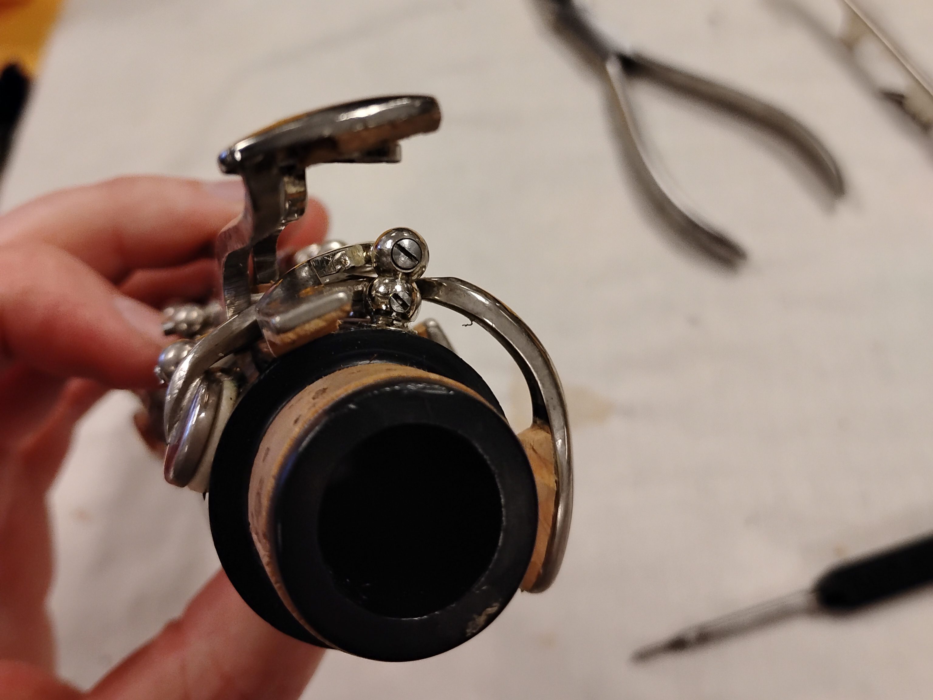 I’m so excited to work on this clarinet! It’ll be getting a full repad, but before I start with that, I want to make sure the keys are all in alignment. The alternate Bb/Eb key was looking pretty funky, so I bent it back before disassembling. I could see that it had been bent with pliers before, and there’s also evidence that the touchpiece has broken off and been replaced. So I took care to be very gentle with it so as not to break anything again.