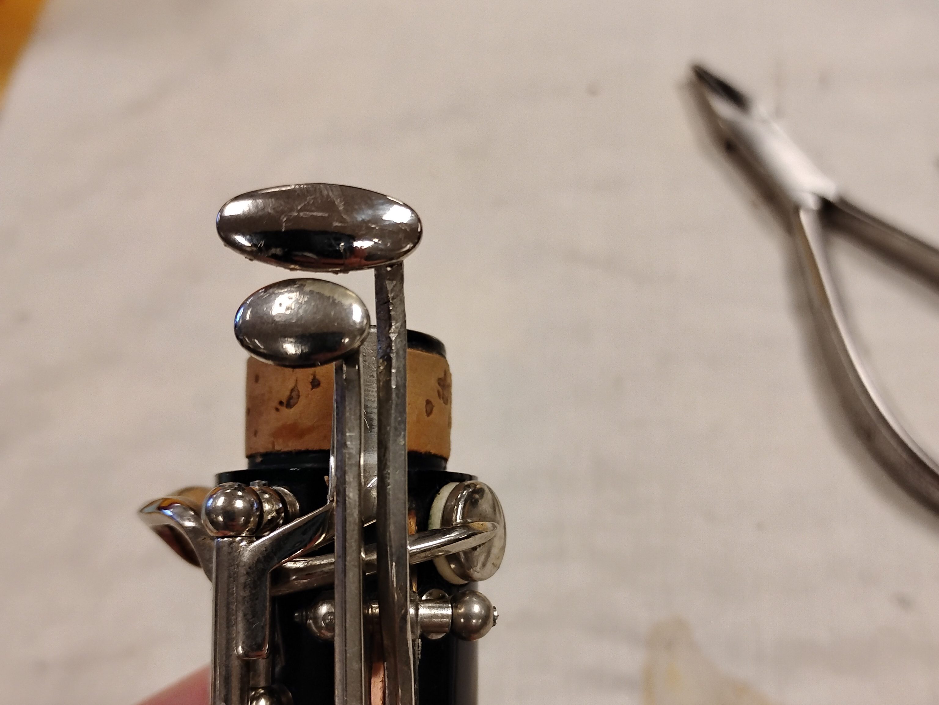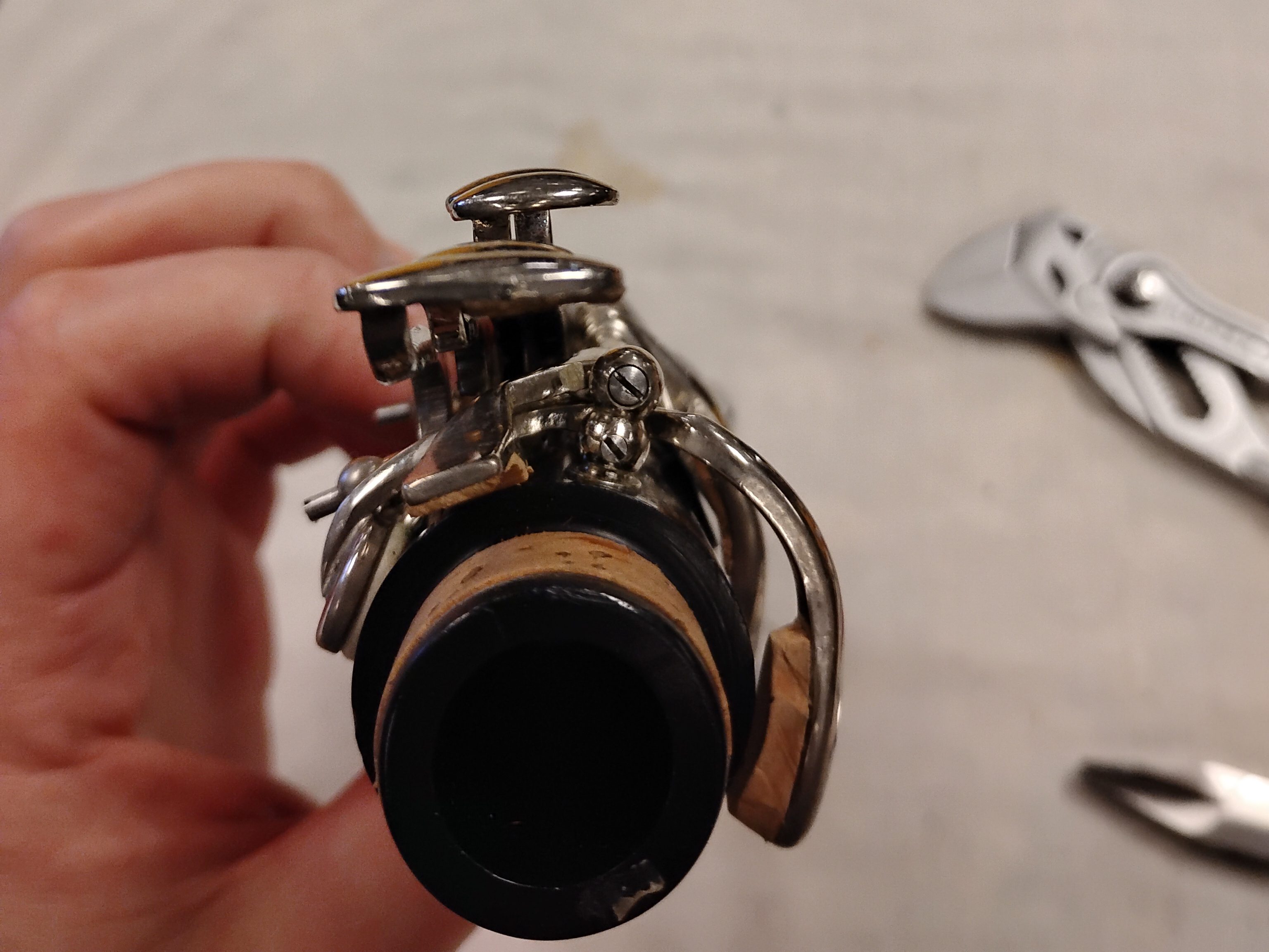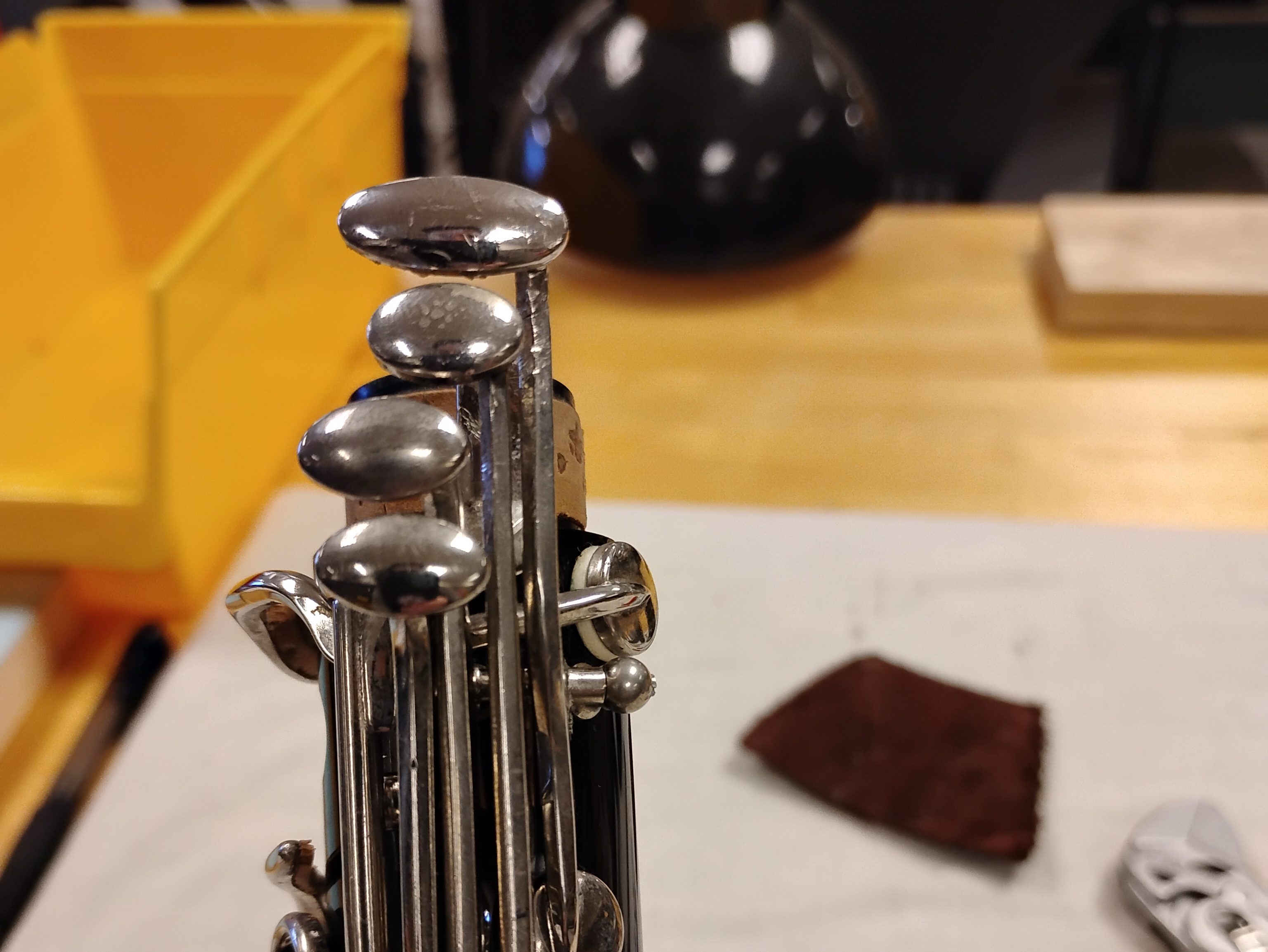 I’m so excited to work on this clarinet! It’ll be getting a full repad, but before I start with that, I want to make sure the keys are all in alignment. The alternate Bb/Eb key was looking pretty funky, so I bent it back before disassembling. I could see that it had been bent with pliers before, and there’s also evidence that the touchpiece has broken off and been replaced. So I took care to be very gentle with it so as not to break anything again.