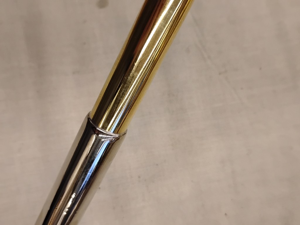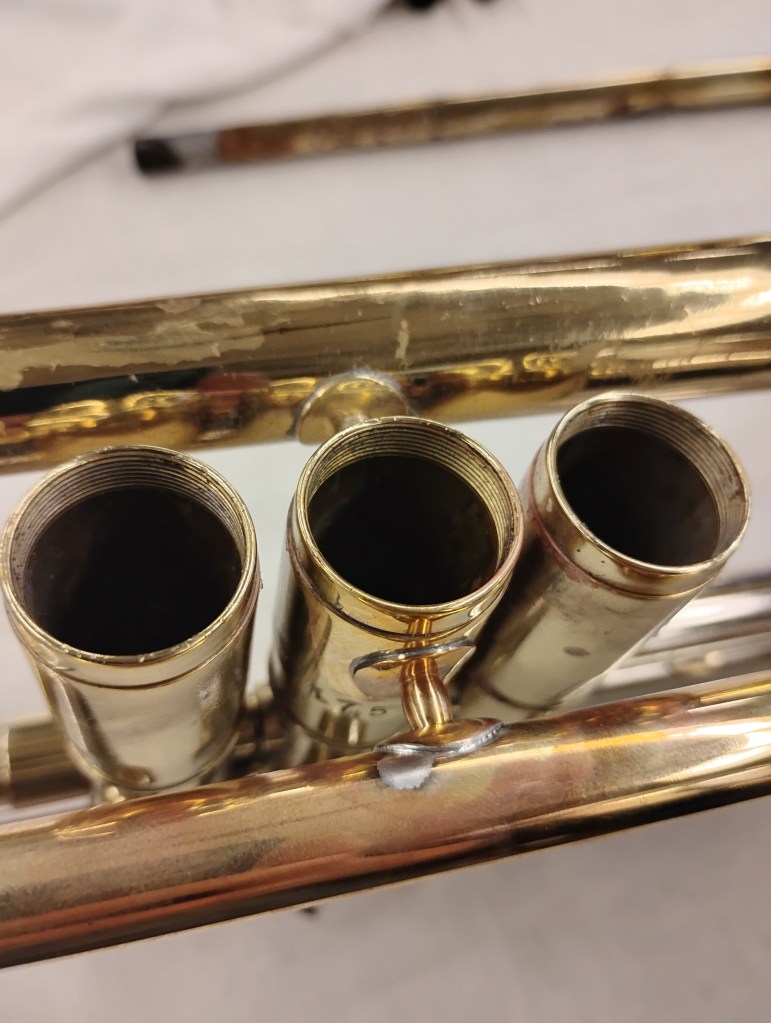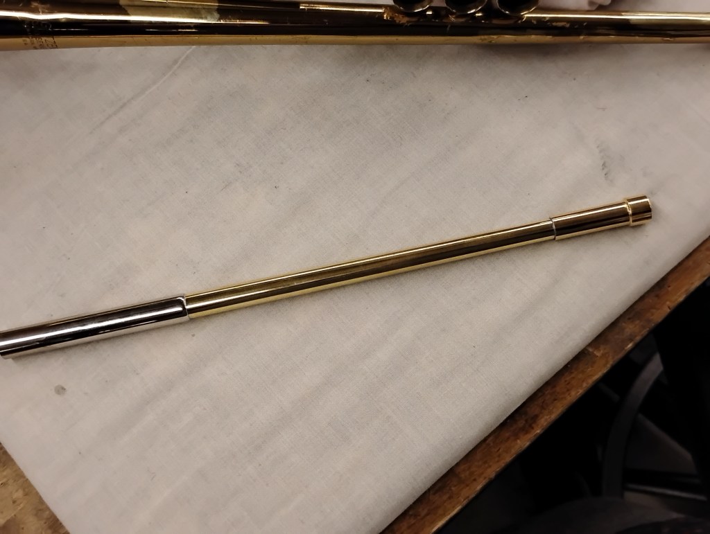 This was one of the most involved projects we’ve done yet, and it was very cool! We unsoldered the leadpipe assembly from the braces holding it in place, then for practice we also took off the braces from the rest of the trumpet. I unsoldered the outer main tuning slide from the leadpipe, and did the same for the mouthpiece (that one was really hard, it was very stuck). I replaced the corroded leadpipe with a new universal part. I hadn’t intended to replace the mouthpiece receiver too, but the old one was damaged by pliers while trying to get it unsoldered. I trimmed the new leadpipe to reach a specific diameter at one end and a specific length at the other, then reassembled it by flaring and shimming the ends. And it’s soldered together again! This is a nice end result.