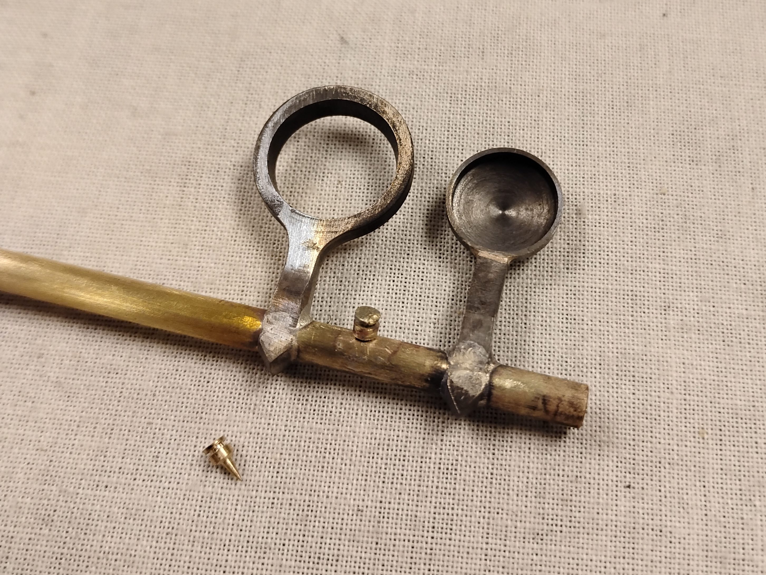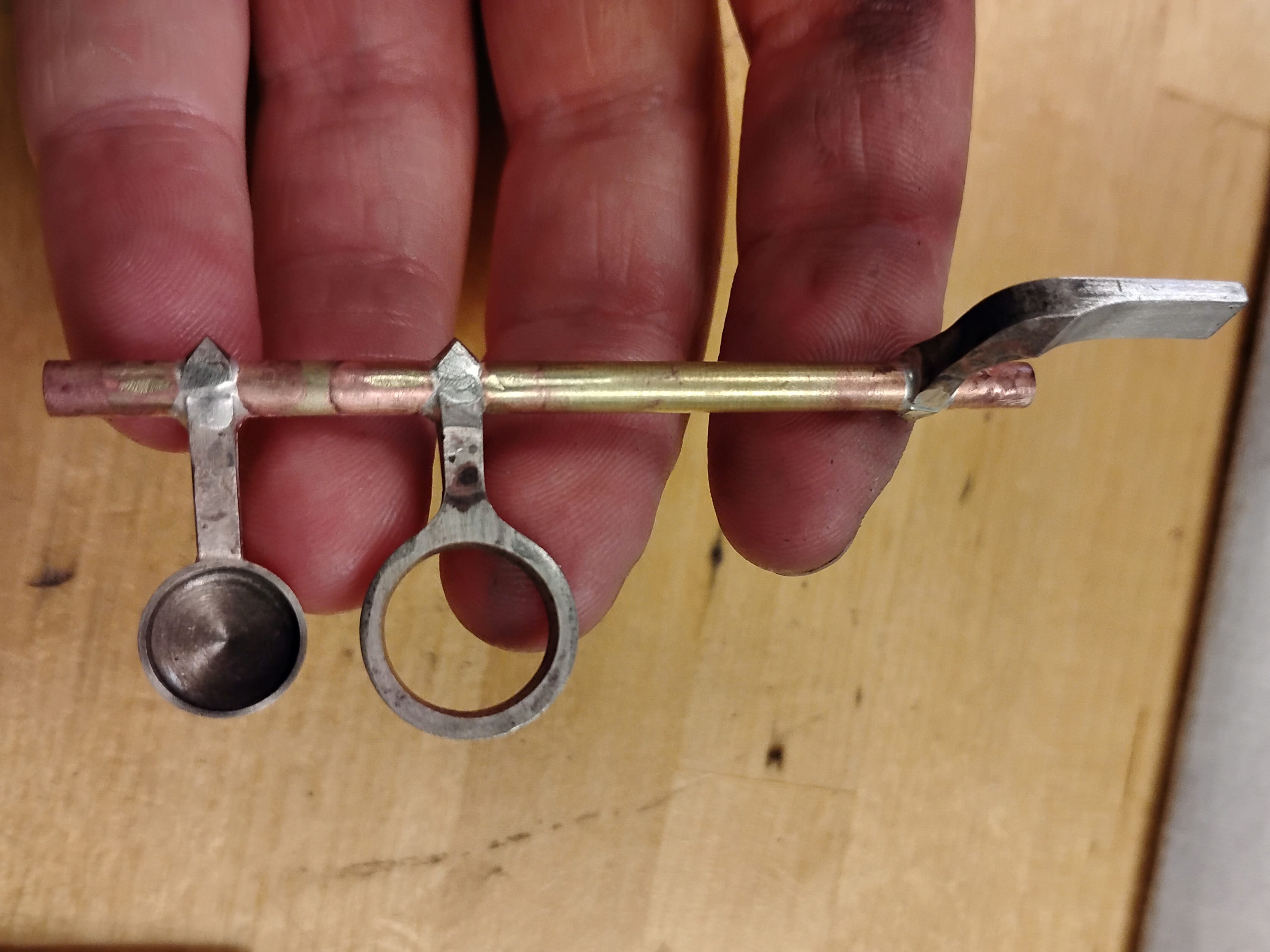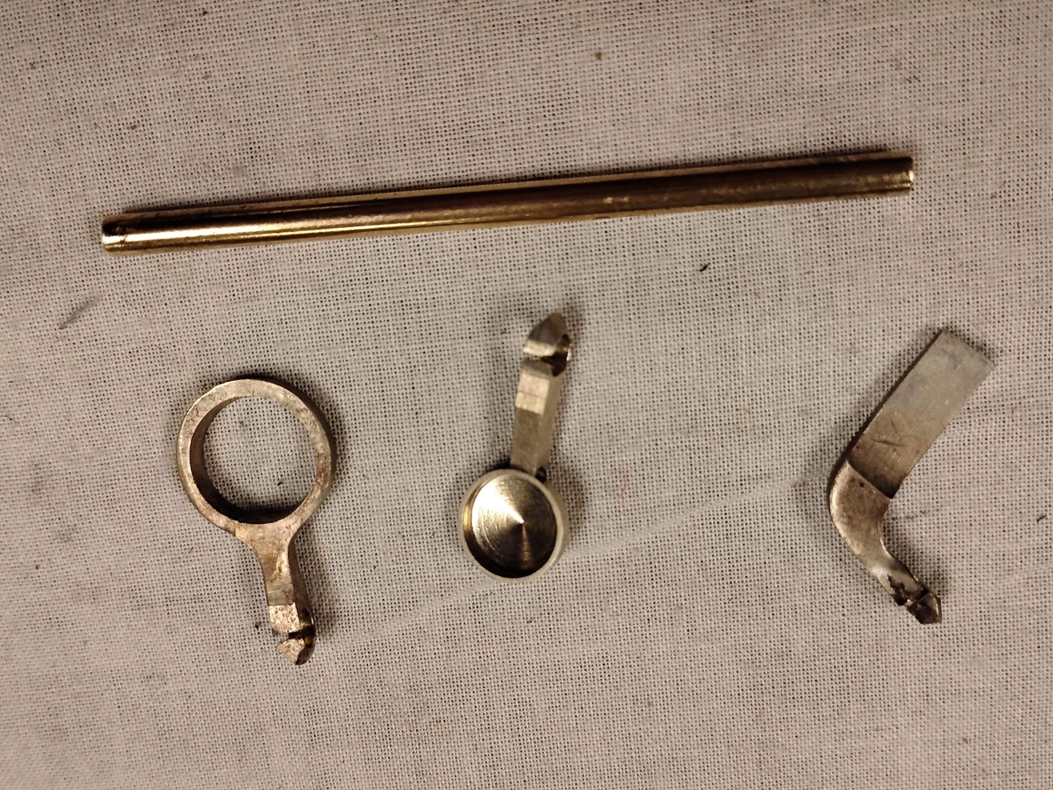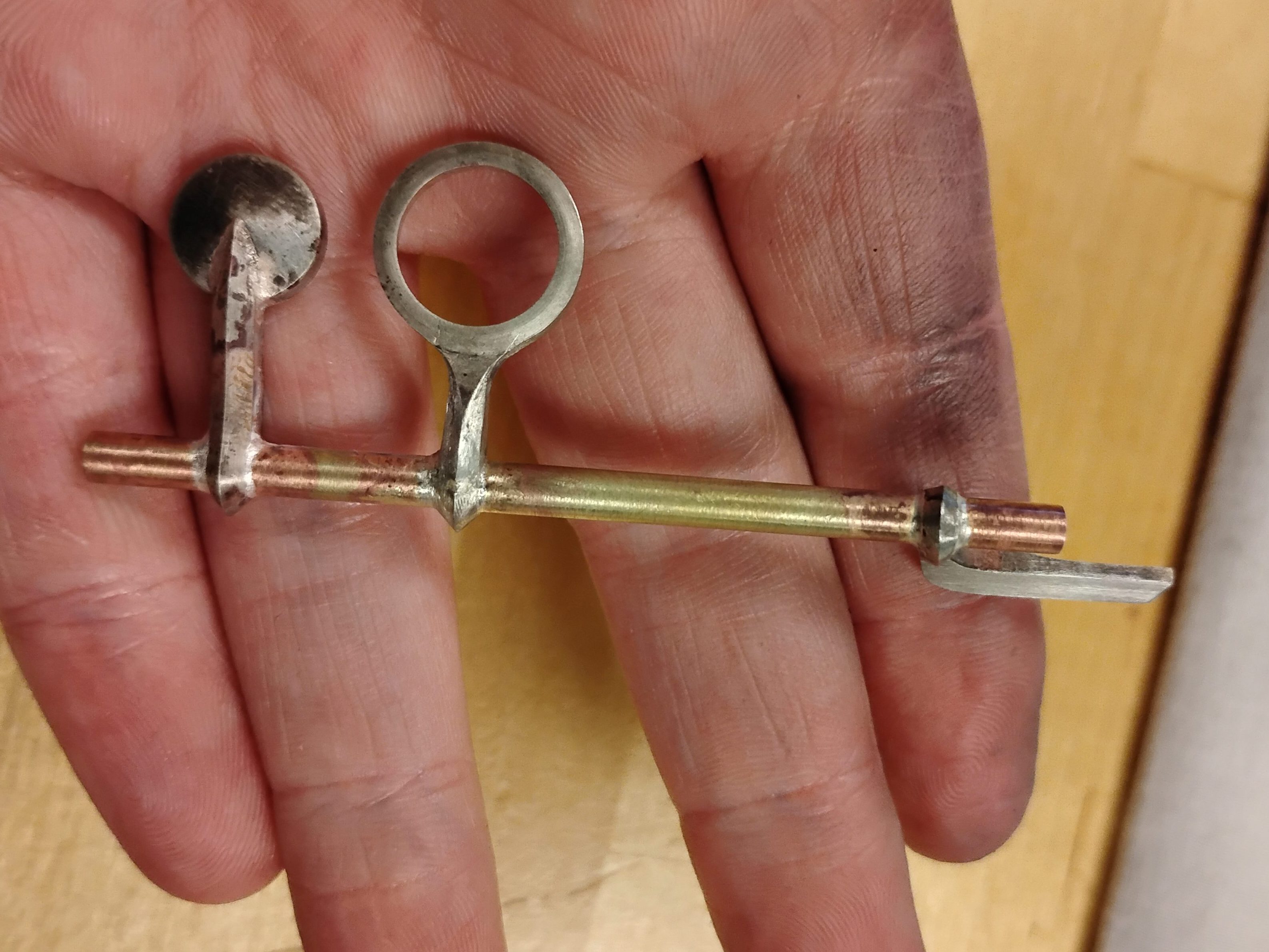 OH boy, this is one of the most satisfying projects I’ve gotten to do here yet. Knockpins were rad as hell, but putting together a whole key from its disparate components has been a ton a fun. I started with a Bb clarinet’s A/D ring key upper bridge, ring, and key, and a solid brass rod (which conveniently already had some holes drilled at the ends, though they weren’t uniform, and I had to trim off one end anyway).