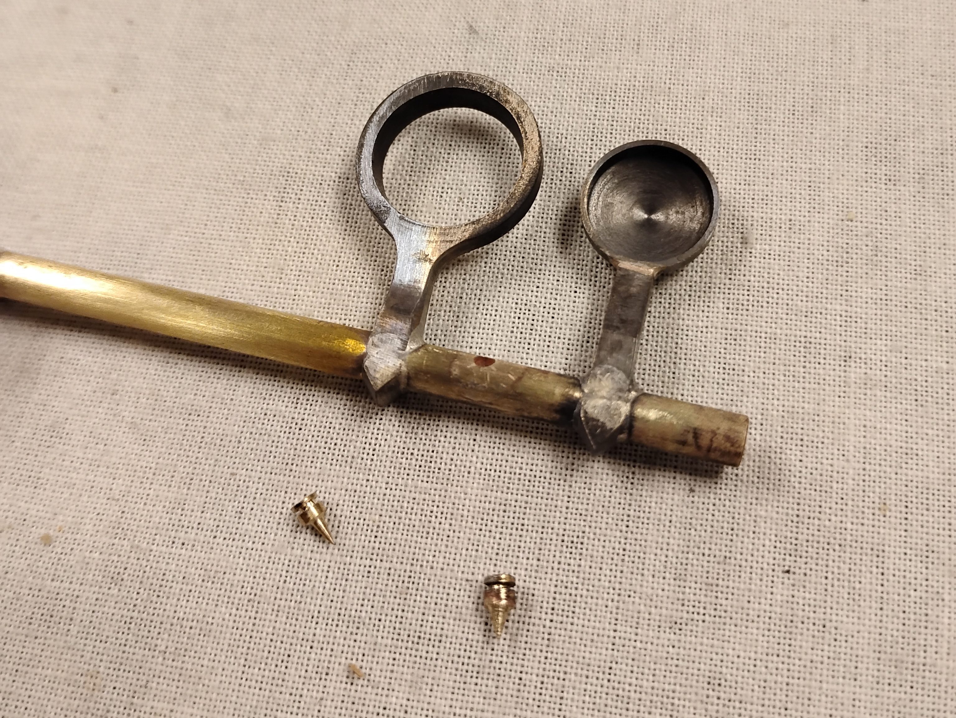 For the spring cradle, that’s something I’ll make from scratch. I’ve never made one, so I crafted two in the bench motor, and picked the better one to actually use. I matched the specs of the existing one, except for filing a spike onto one end which I’ll place into a hole I’ll drill in the key before I solder them together. Oddly, drilling the tiny tiny hole into the side of a tiny tiny cylinder might have been the hardest part of the project. Here’s pics of the cradles I made, plus how it fits in the hole, then post-soldering. (This was actually my second soldering attempted, after trying and failing to use paste solder, and you can see the shadow of the failed attempt on the rod, which is interesting.)