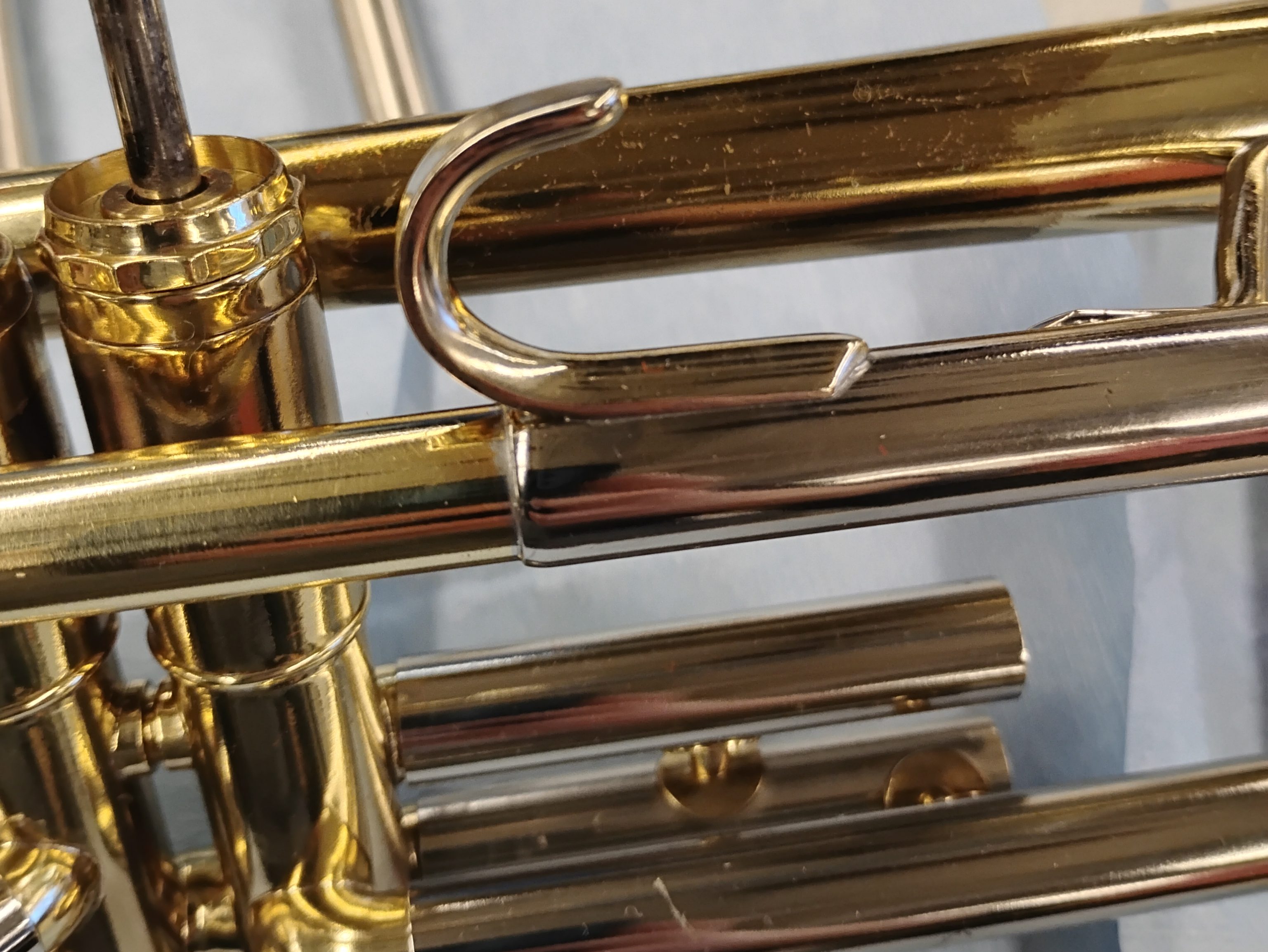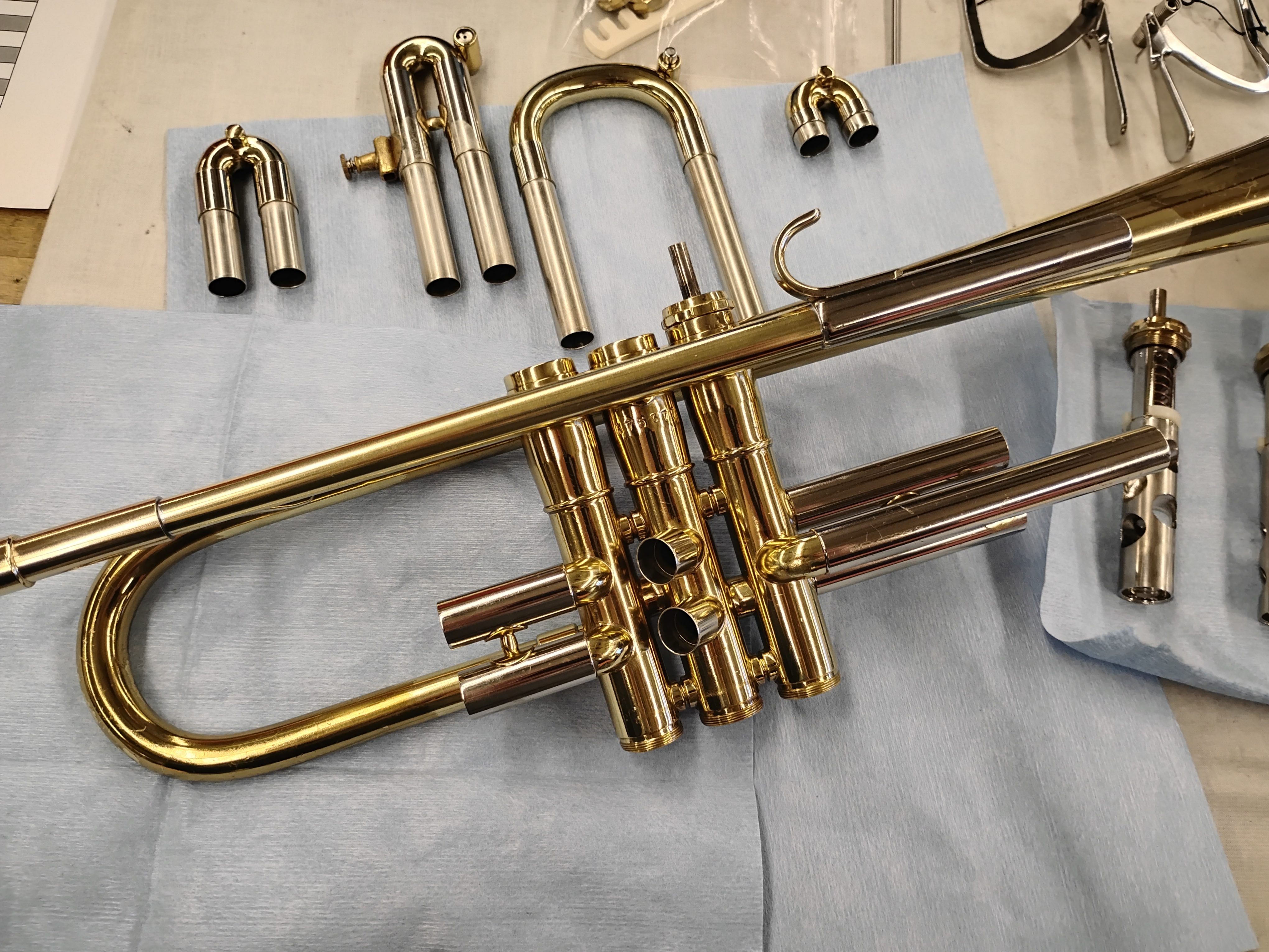 I’d heard that not too long ago, people typically soldered bells back on by just holding it at the casing braces with one hand and holding solder in the other, with the torch on the bench. I gave it a good try that way before deciding that I’m much less likely to accidentally heat parts of the instrument I don’t want to heat if I can fixture the trumpet and hold the torch. So with the bell held on by pipe cleaners on either side of the casing braces, I triple checked all my alignments, and soldered first the tail, then the casing brace, then the 1st slide to bell tail brace. Thank goodness it all went well! Then it was just a matter of the S-braces and the finger hook going back on. Here’s the trumpet now, after buffing and spot lacquering all the spots that I soldered.