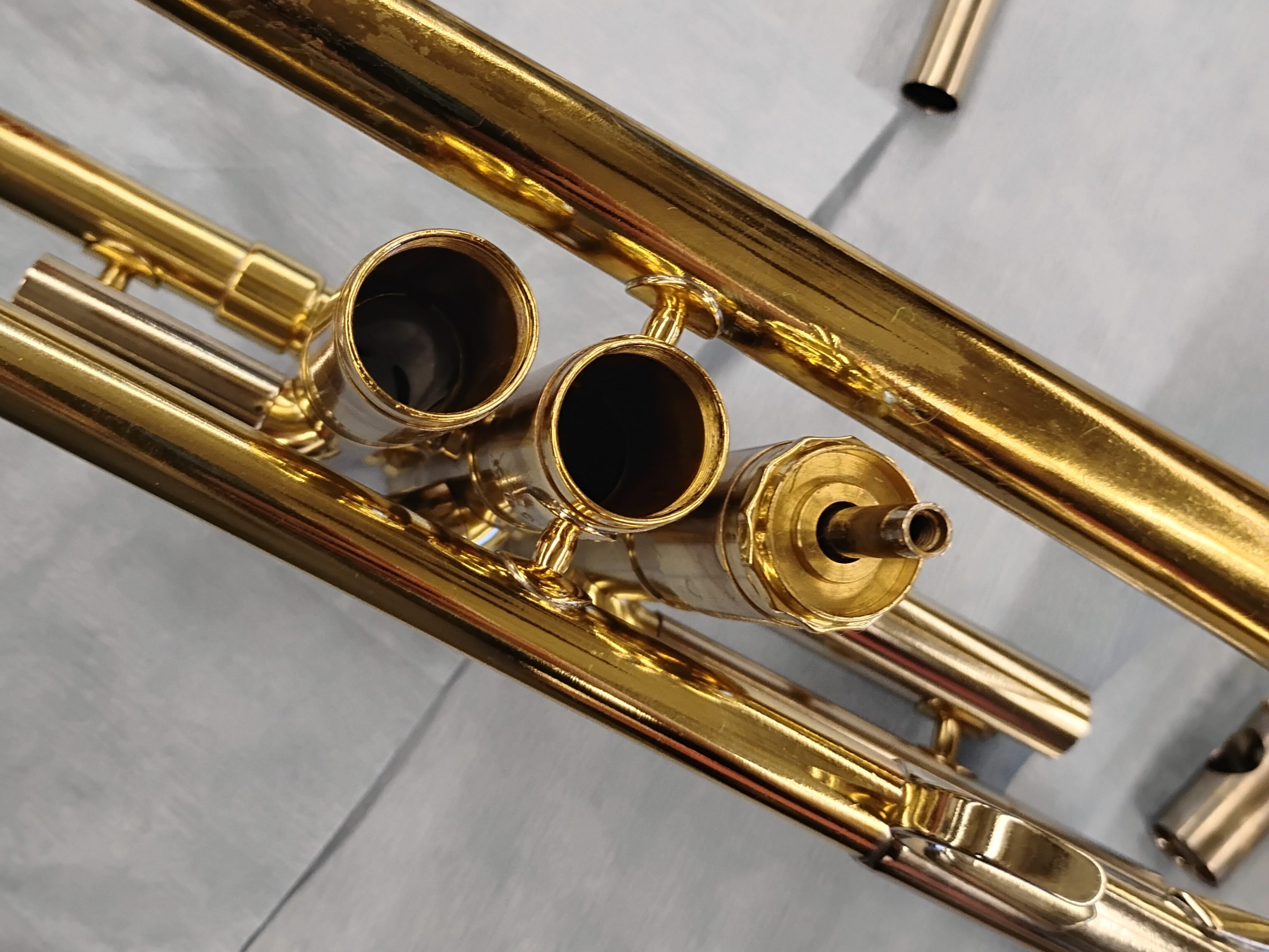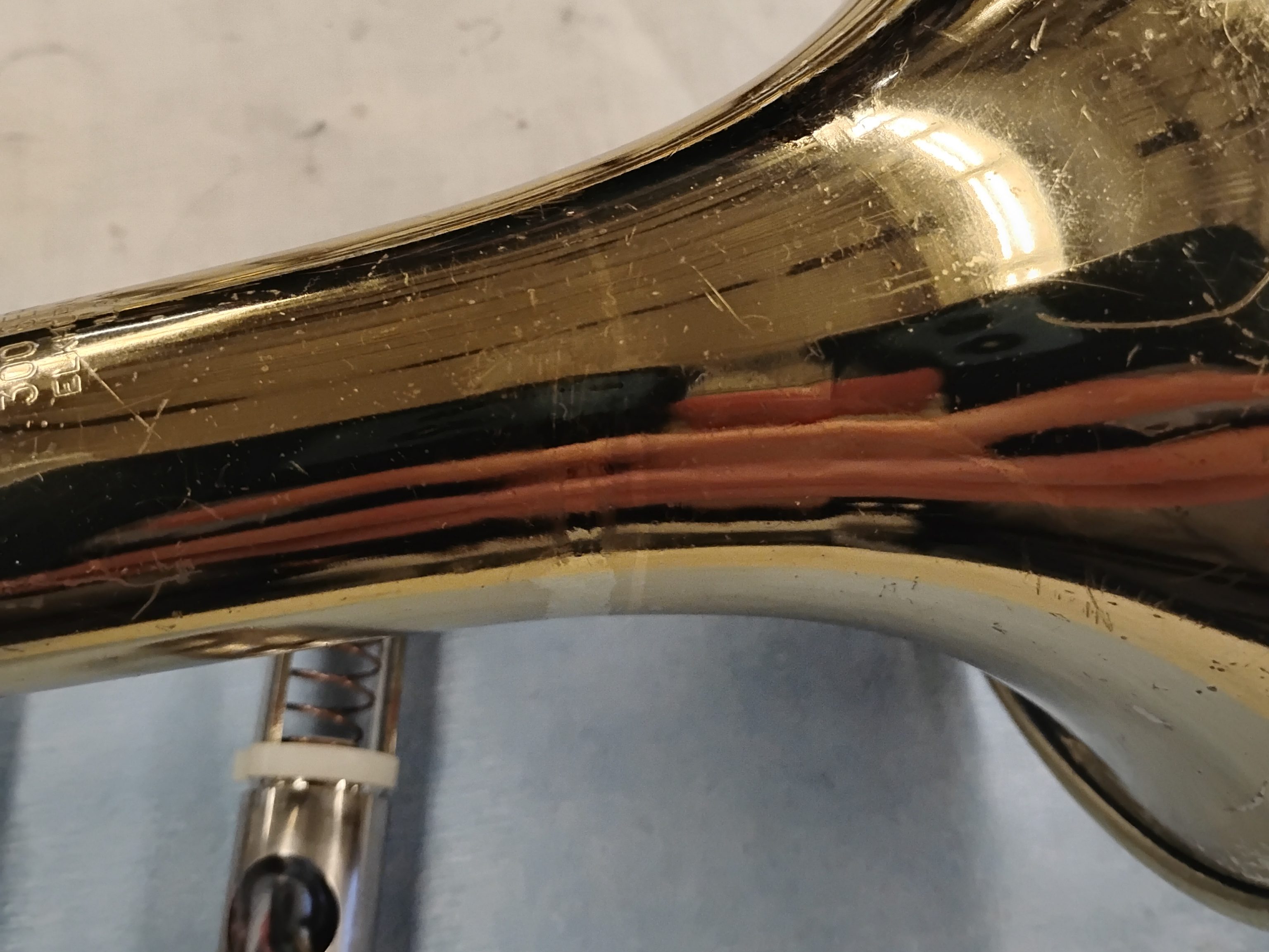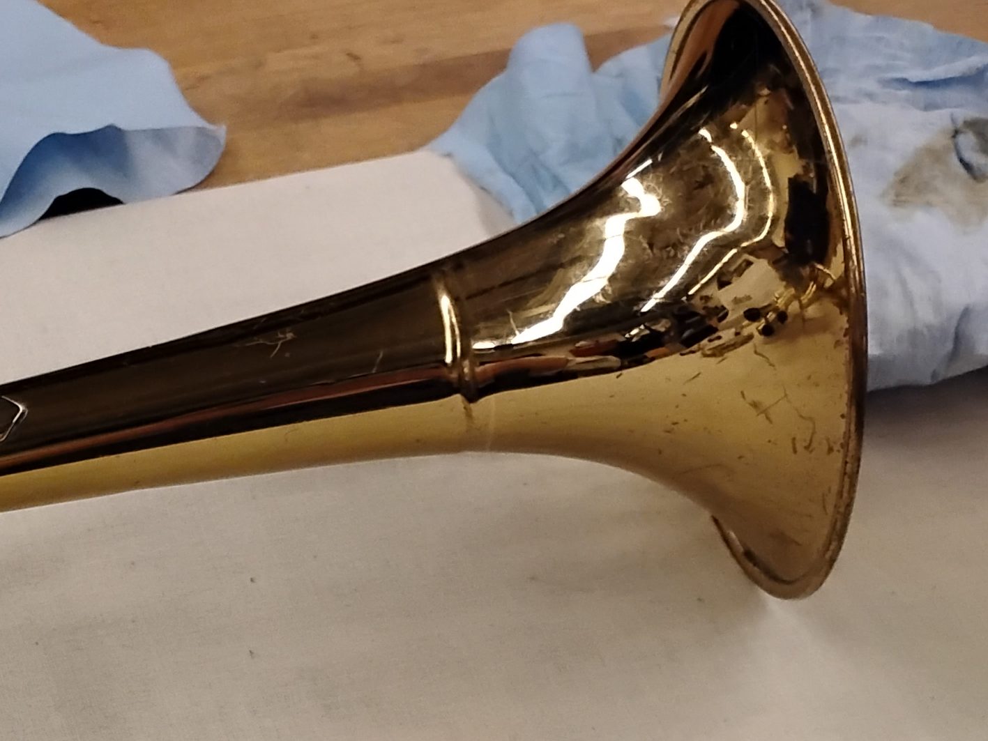 Another fun update on this one: this trumpet had a beautiful dent in the bell throat when I received it. It was a ring that went about two-thirds of the way around the throat, with the brass pushing exclusively outward, not crinkling inward at all.