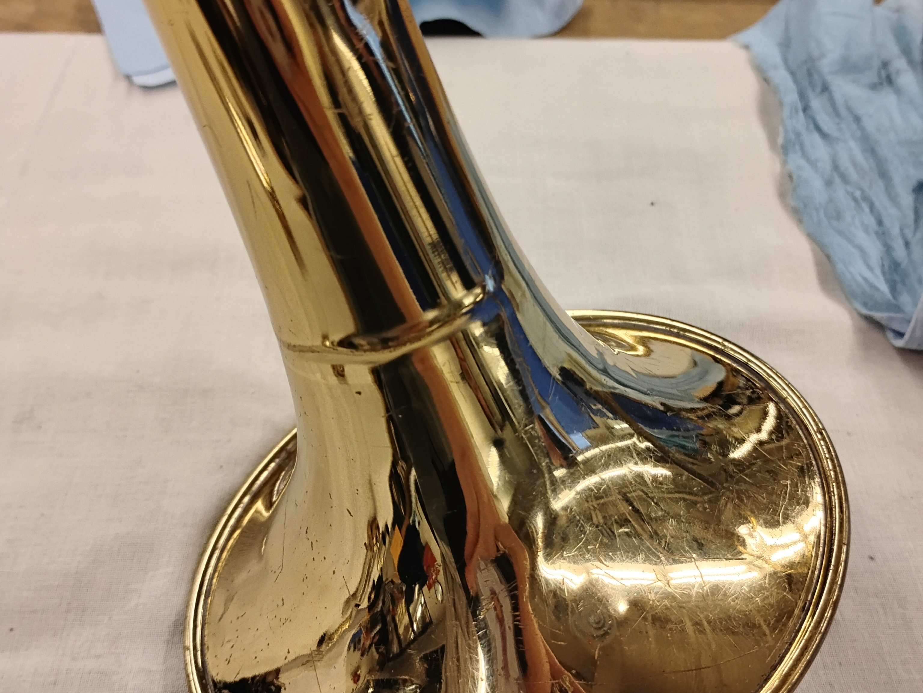 The crinkle was pretty sharp, so I wanted to be careful not to do anything that would fold the brass. A flat dent roller isn’t an option for fear of turning the tight radius of a trumpet bell into a polygon. That left me with tapping with a mallet. It took quite a while, but I began by tapping with a very domed delrin mallet, the bell only supported by wood, and eventually transitioned to tapping with the flatter side, as the dent got duller, and supported the bell with a metal mandrel. I finished with a little bit of re-rounding with the mandrel, burnishing, and finally the buffing that the whole trumpet got before the spot-lacquering post-soldering. It turned out so nicely!